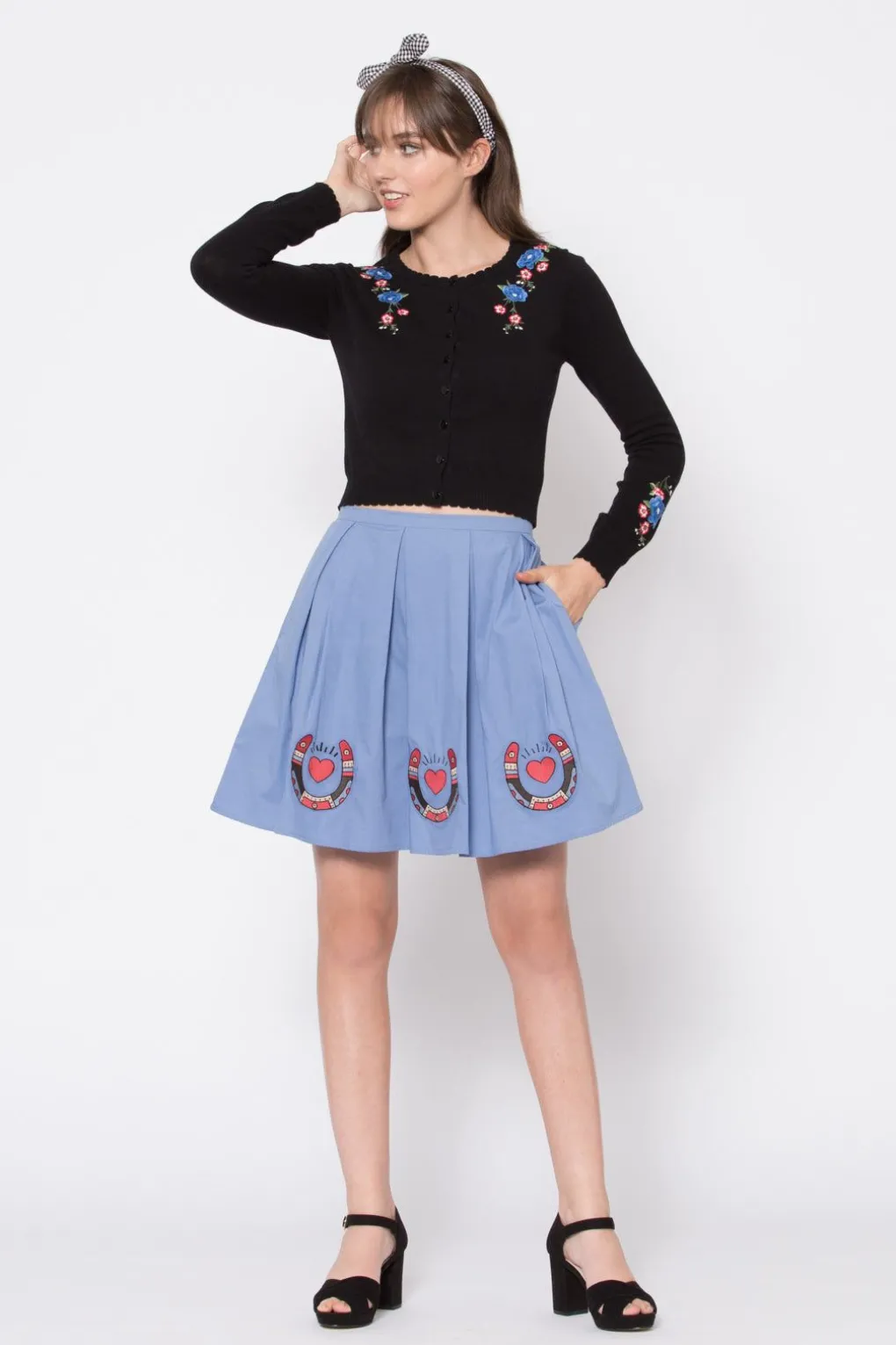 We Love This Skirt! Made In 100% Cotton, The Appaloosa Love Skirt Features A Flared Silhouette With Waistband, Centre Back Zipper And Horseshoe Embroidery At The Hem. Available In Cornflower, Team The Appaloosa Love Skirt With The Lonesome Cowboy Blouse Or The Sundance Blouse