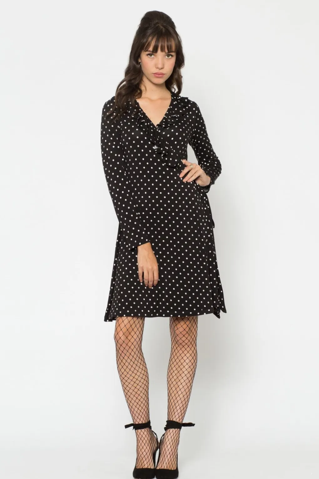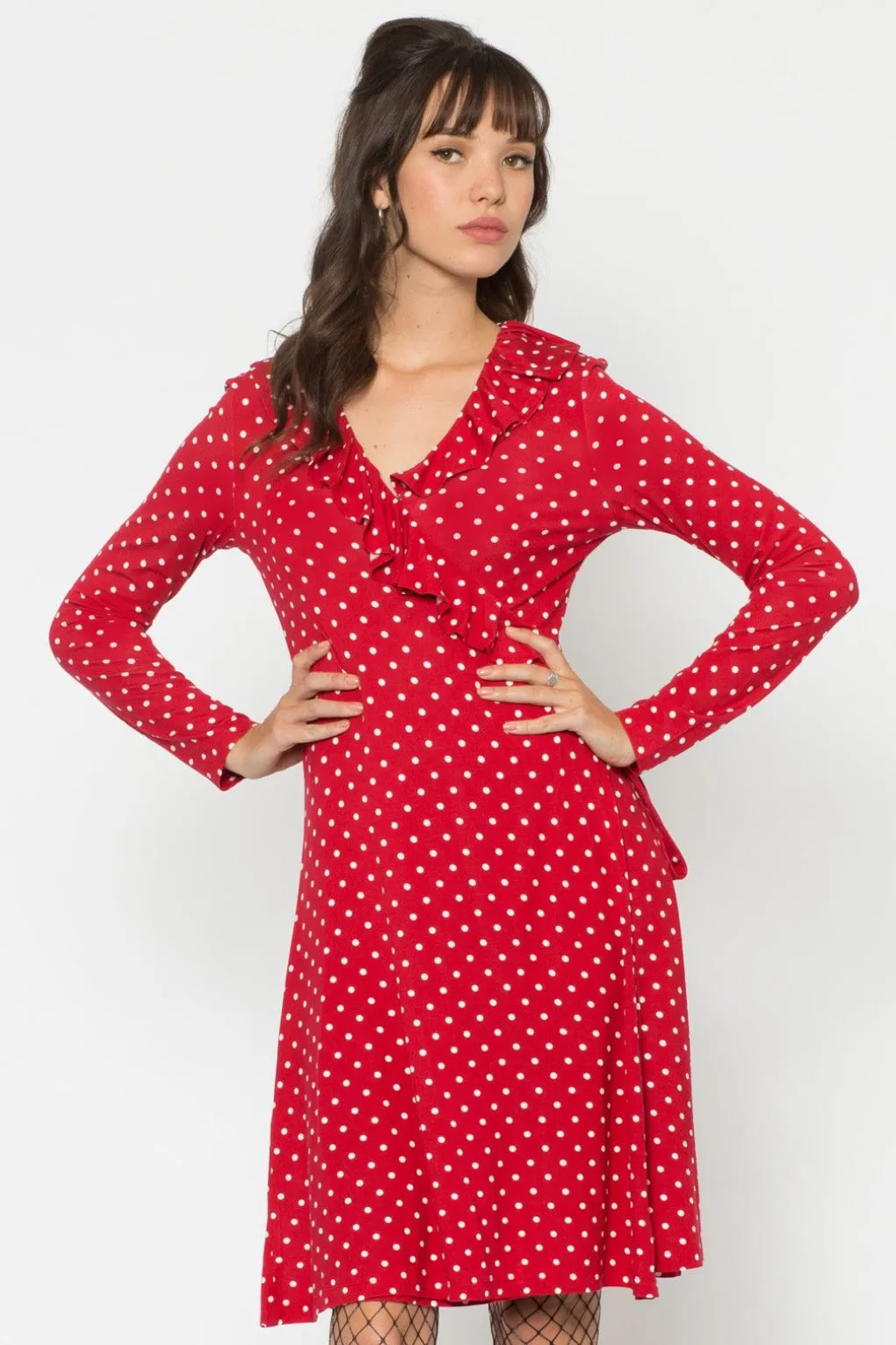 Youll Like This Sweet Number! Made In A Viscose Elastane Blend, The As You Like It Dress Features A Fully Functioning Wrap Silhouette, Long Sleeves, V-Neckline With Ruffle And All Over Spot Print. Available In Cherry Red/ Cream And Black/ White, Team The As You Like It Dress With The Villager Cardigan Or Ruby Coat