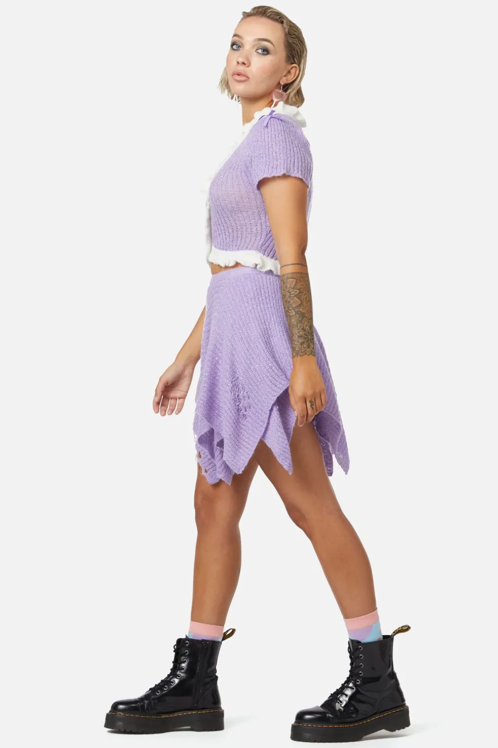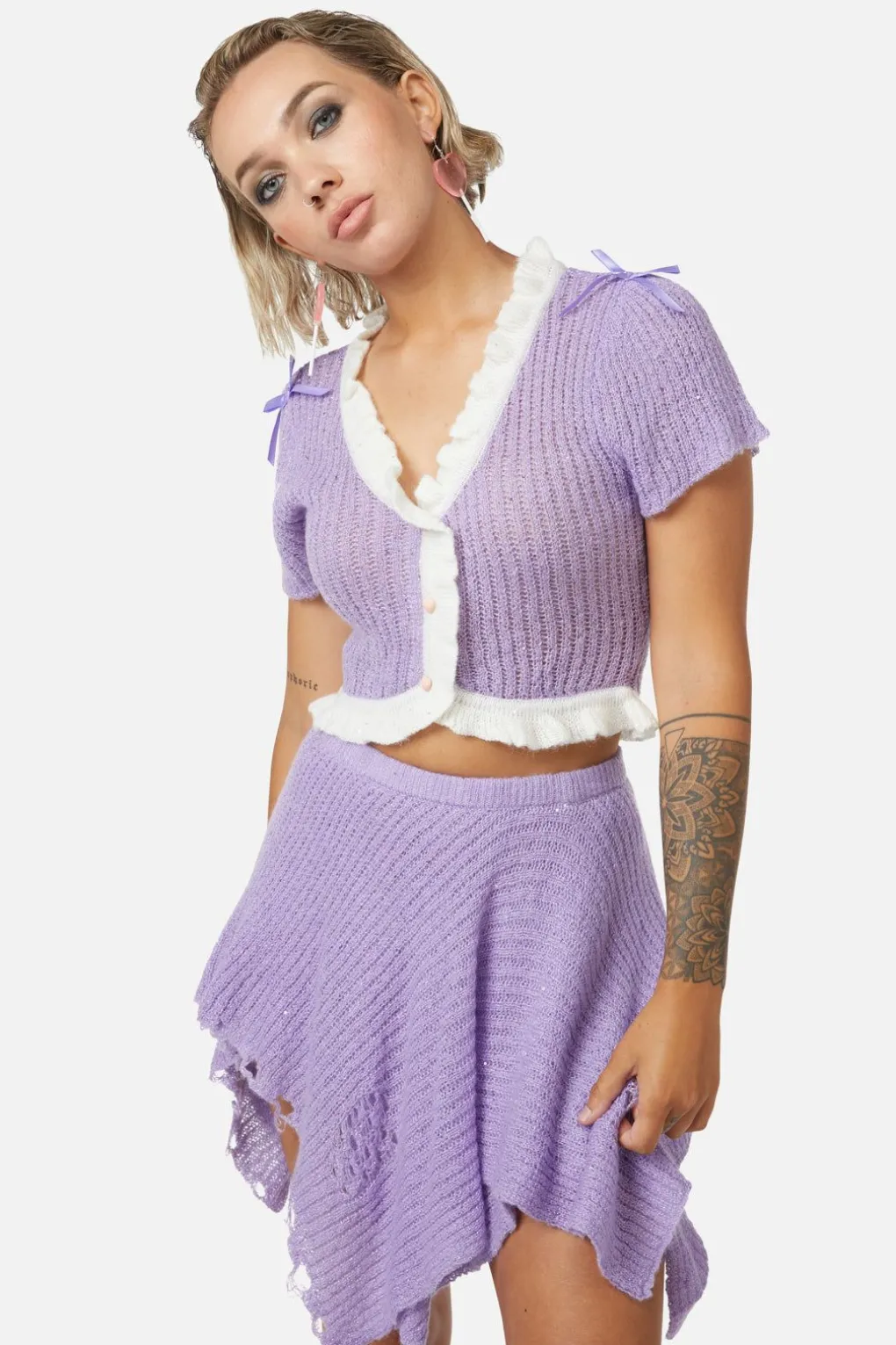 -Features Ruffle Knit Neckline & Hem
